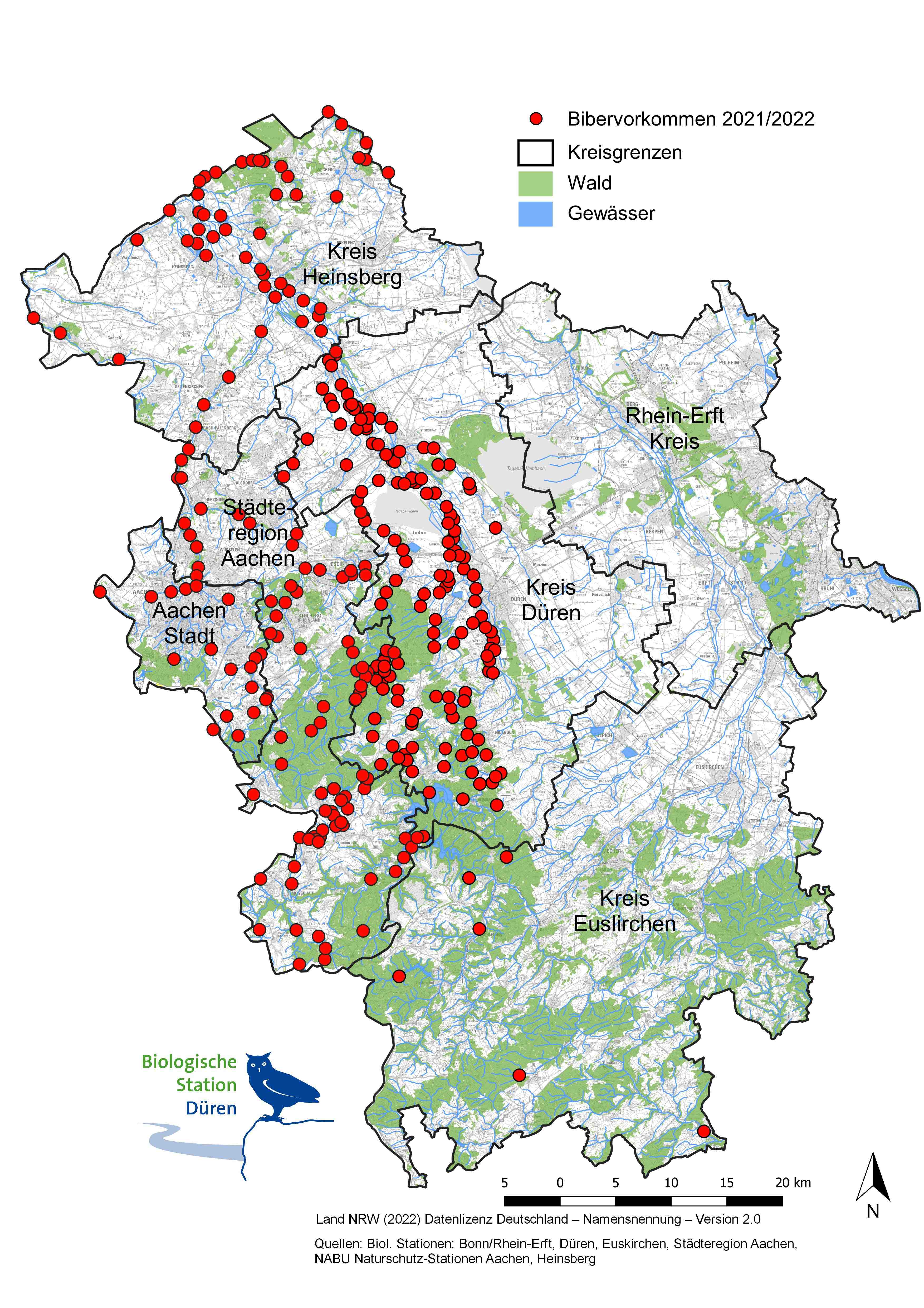 Nach der Wiederansiedlung im Jahr 1981 hat sich der Biber im Kreis Düren und inzwischen weit darüber hinaus etabliert. Doch wo gibt es Biber, wo (noch) nicht? Wie haben sich die Bestände entwickelt, wie rasch breiten sich die Biber aus, welche Bestandsdichten hat er erreicht?