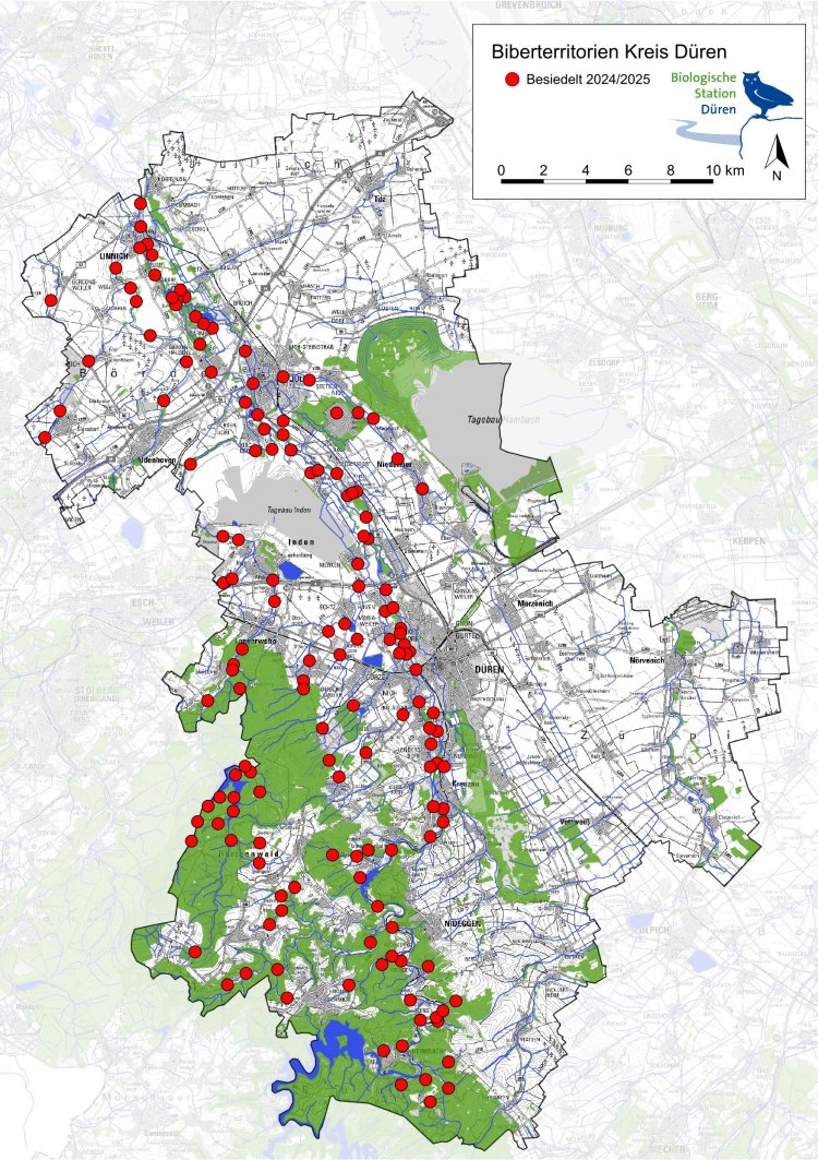 Dank zahlreicher Personen, die bei der Erfassung geholfen haben, war es auch 2024/2025 wieder möglich, die Biber im gesamten Kreis Düren zu kartieren. Damit liegen nun die Ergebnisse des sechsten, alle drei bis vier Jahre stattfindenden Biberzenus vor. Allen, die mitgemacht haben, möchten wir nochmals herzlich danken.