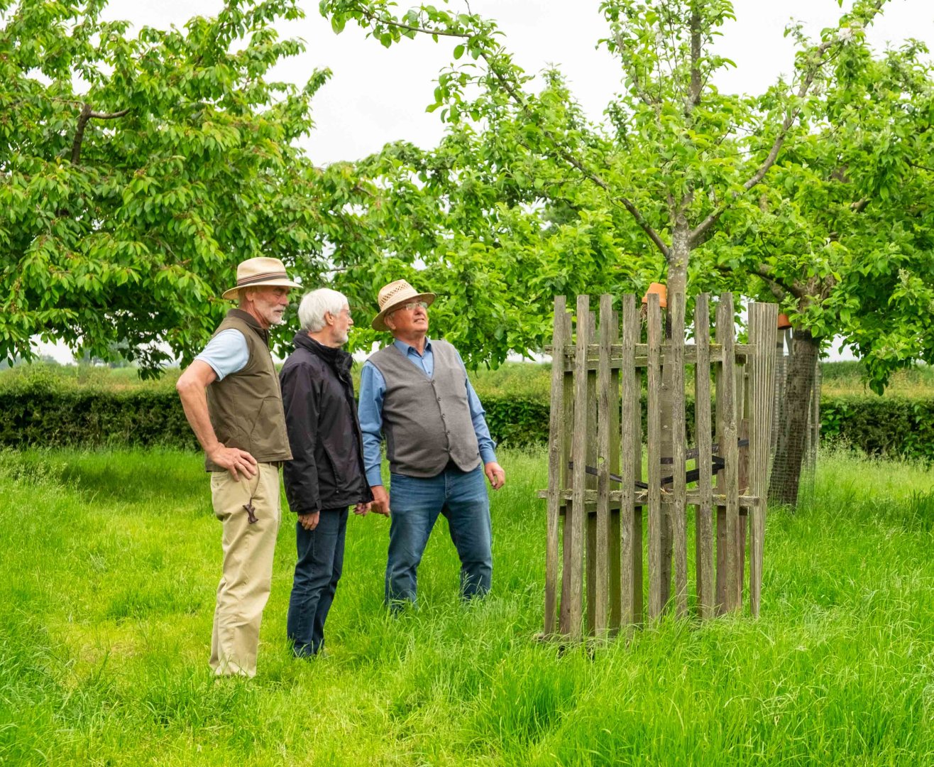 Um Obstwiesen dauerhaft zu erhalten, ist eine kontinuierliche Pflege der Bäume nötig. Klaus Flaskamp, Harry Vollmer und Rainer Schwerdtfeger zeigen die Praxis des Obstbaumschnitts anhand eines Baumes, der gemeinsam mit den Kursteilnehmern einem Pflegeschnitt unterzogen wird.