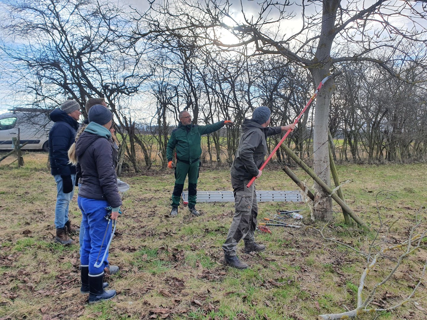 Um Obstwiesen dauerhaft zu erhalten, ist eine kontinuierliche Pflege der Bäume nötig. Wilfried Trimborn gibt am Anfang eine theoretische Einführung bevor es dann zur Praxis auf die Obstwiese geht.