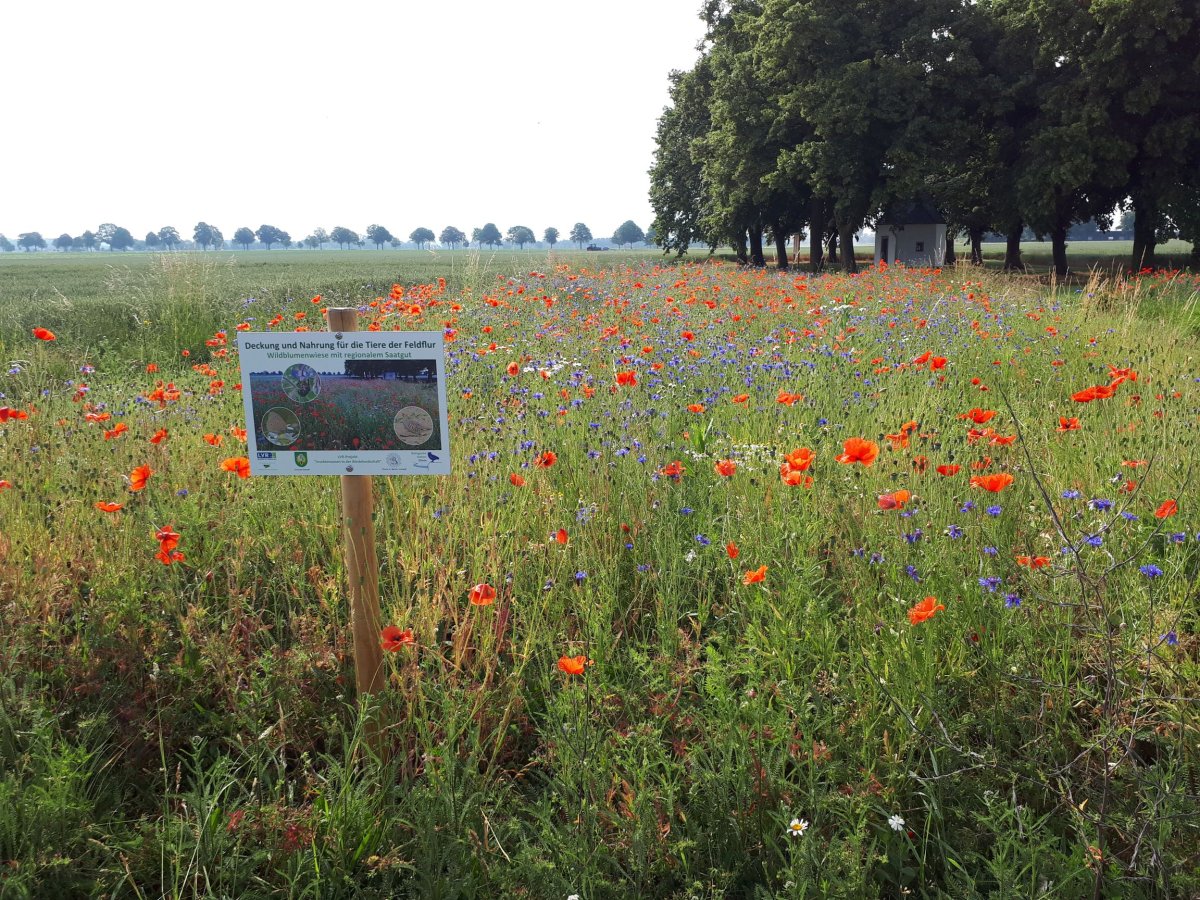 Zum Idealbild unserer Kulturlandschaft gehören bunte Wiesen, Wegsäume und Blütenvielfalt. Die Realität stellt sich zumeist anders dar, Bestäuber fallen zunehmend aus, das Thema Insektenrückgang ist in aller Munde. In einem kooperativen Ansatz mit der Landwirtschaft sollen strukturreiche Lebensräume für Insekten in der Börde wiederhergestellt oder optimiert werden. Der Bedarf an solchen höherwertigen Landschaftselementen ist eindeutig gegeben. Hier setzt das Projekt an. Bei den projektteilnehmenden Kommunen ist das Interesse geweckt, sich gezielt für die Insekten in der Bördelandschaft einzusetzen. Von artenreichen blühenden Wegsäumen profitieren schließlich nicht nur Insekten, sondern auch Feldvögel die für ihre Jungen Insekten als Nahrungsgrundlage benötigen. Die in Nordrhein-Westfalen vom Aussterben bedrohte Grauammer ist nur eine von vielen Arten, die in der Brutzeit in der Jungenaufzucht von Insekten abhängig ist. In den für das Projekt ausgewählten Kommunen liegt ihr Hauptvorkommen in Nordrhein-Westfalen. Des Weiteren bieten strukturreiche Säume Deckung für zum Beispiel Feldhasen und Nesthabitat für unter anderem Rebhühner.
