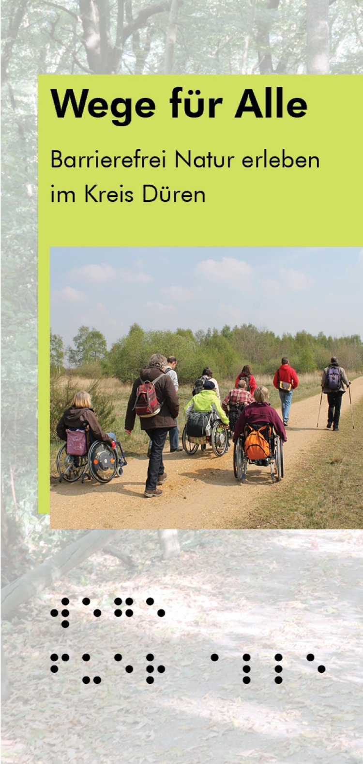 Faltblatt über drei barrierefreie Wanderwege im Kreis Düren mit Informationen zum Gebiet und Tipps zur Anreise. Mit Braille-Prägung.